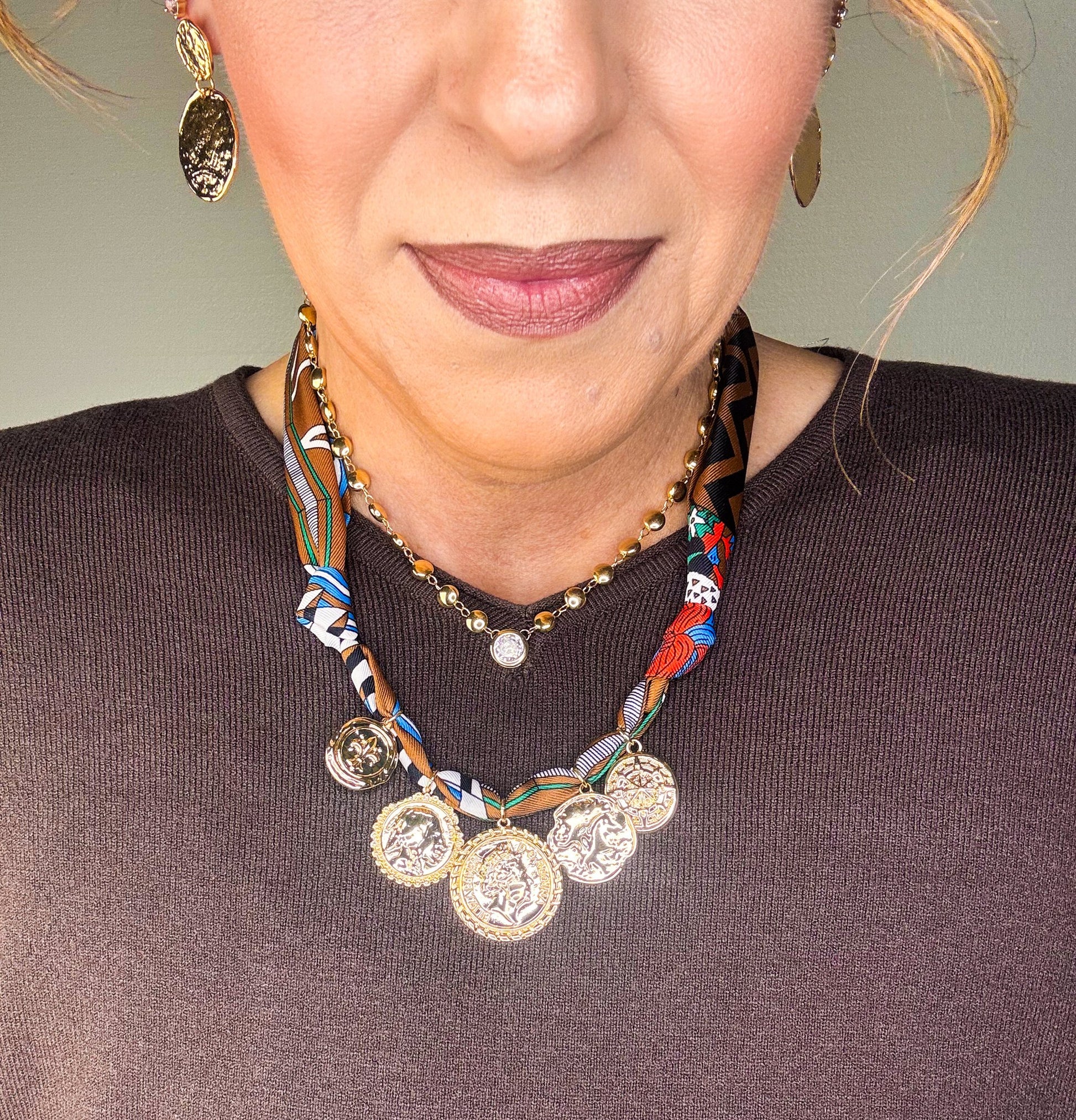 An eclectic mix of golden coins finds its balance against a soft brown woven scarf, creating a necklace that feels both storied and modern. Each charm—etched with unique textures and designs—evokes a sense of discovery, as if gathered from far-off travels. A piece made for layering or standing beautifully on its own.